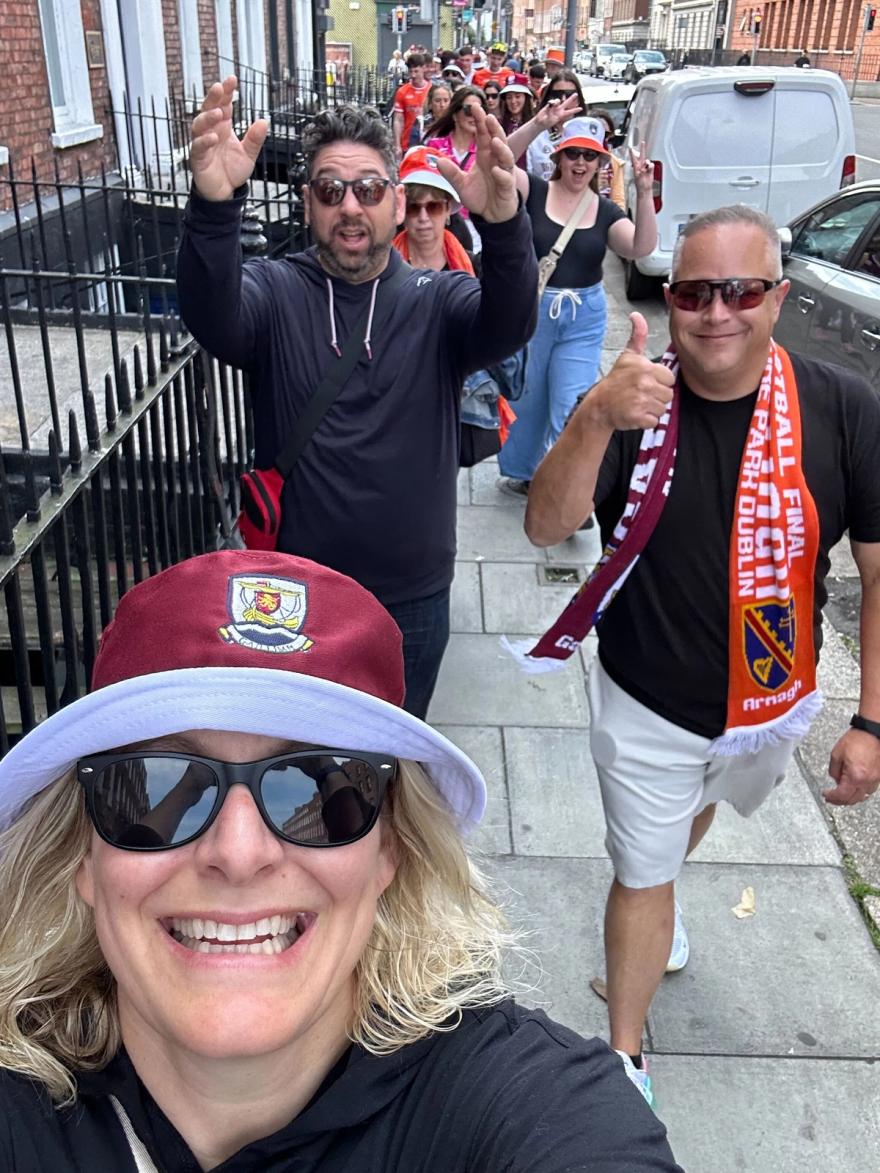 It was about a 2-mile walk from our hotel to the stadium. It was a perfect summer day, and it seemed that everyone in the city was either on their way to the game or already at a pub waiting for it to begin. It felt like a giant party the whole walk. As we got closer to the stadium, there were people with tables set up at almost every street corner hawking Galway and Armagh gear. I secured a Galway bucket hat to show my support, which became a good way to start conversations with people as we made our way to the game.