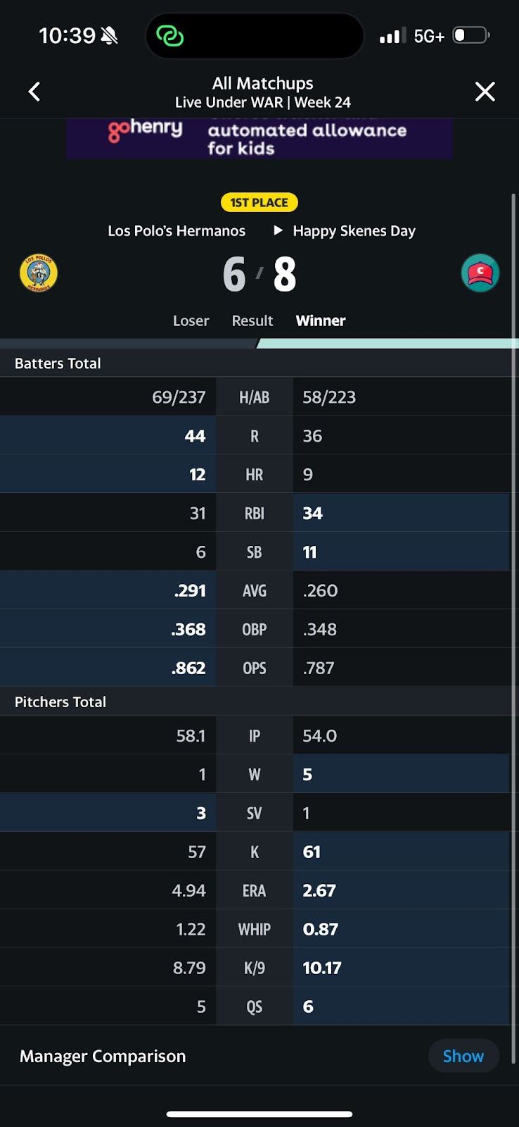 NOBODY, I repeat NOBODY wants to read about how my fantasy baseball team fared this season…but I’m going to tell you anyway, because it got me back into being a casual fan of the game. So thank you to Soly for setting up the league, and to Rob Manfred for pushing through the rules changes that made it a lot more watchable than when I stopped watching over a decade ago. And congrats to Soly on his impressive (and tainted) victory. This is also a test to see if he reads these. He won the league, fair and square, after the nearly-impregnable roster I assembled had an off-week in the semis against a hot Polos Hermanos squad (my totals would’ve beat both guys in the other semifinal matchup) and then absolutely went off for nearly across-the-board season totals in the final week that had everyone’s jaws on the floor and made the championship matchup look like the last-place game. The good news is it’s a keeper league and I mortgaged the entire 2025 season for success this year, so I’m devoid of good keeper options AND traded away a bunch of draft picks. Shoutout to David Tepper! Anyway, hats off to Soly on a great season. We may be adding a couple of expansion franchises over the offseason!