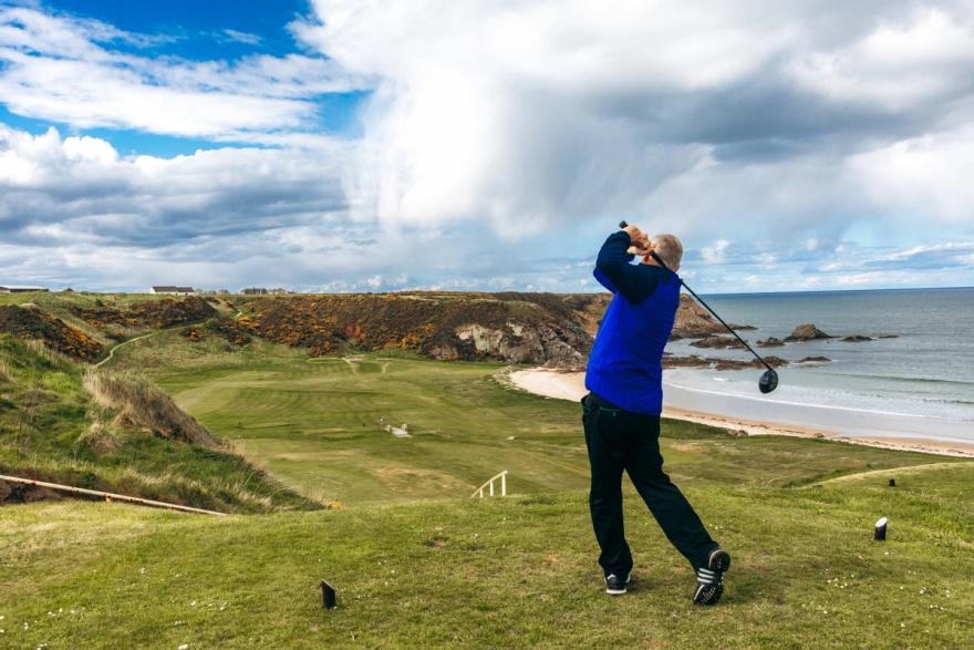 With a short and efficient Scottish swing, George was a joy to play with. He gave us the grand tour of the ethereal Cullen Links. You could sense his pride in the course and excitement in the fact that it was starting to receive some notice in the golf world due to the visit from NLU. “I had a man stop me on the street in Aberdeen and shake my hand. He said, “You’re George from Cullen in the No Laying Up video!” It’s all been amazing. Our visitor play is up 30% just now.” He hopes the time has come for more acceptance in the game for courses like Cullen. “I live in Aberdeen now and I’m a member at Murcar, but I drive up here as much as possible to play.” You cannot play Cullen Links without a smile on your face. You might even shoot around par. You may not lose any golf balls. You will play fast. You will hit shots on the ground and over towering red rock obelisks. These are all good things.