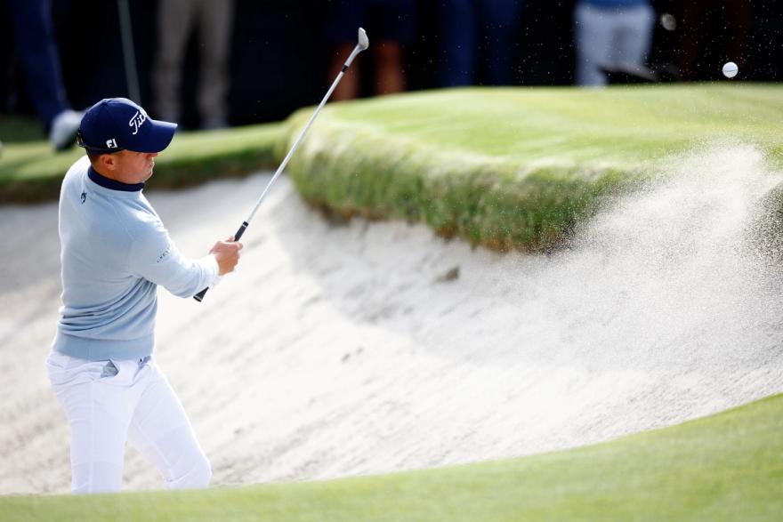 Justin Thomas plays his shot from the bunker on the 10th hole during the first round of the The Genesis Invitational at Riviera Country Club.