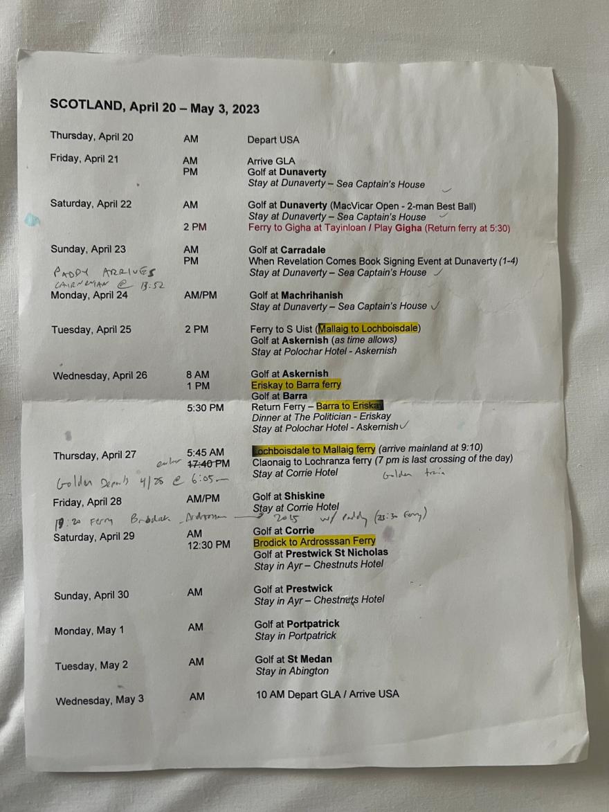 Planning any trip is an iterative process. So two trip planning enthusiasts/logistics sickos planning a multi-modal trip to a remote region during a disastrous time period for the Scottish ferry system was bound to be a carnival of sorts. Our tentpoles were the book signing at Dunaverty, the associated stop at Machrihanish, some adventure out west, and then ending up on Arran, which isn’t the easiest place to get back to.